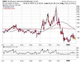 A more speculative play could be the UltraShort Real Estate ProShares (SRS). This ETF moves inverse to real estate, so it goes up as the market goes down. A quick look at the chart shows a huge spike in November and a drop since then. It is now trading at two-year lows, so you could view it as a more speculative play on the continuing decline of the housing market.
